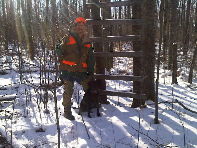 We've been hunting grouse here for 30+ years and always see tons of deer tracks and quite a few deer stands. Since this is public hunting land, you cannot claim a stand as your own. What a bummer; find a spot, trim the unwanted limbs, haul in the wood, construct the stand, blaze a trail and hope no one is in your stand on opening day. One of the stands 100 yards from the road has a sign listing the "owner's" name and address. Is this supposed to keep folks out of "his" stand?